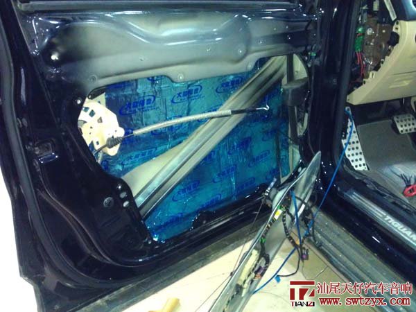 清洗完工作后,里层隔音施工,为了防止脱落,里层的隔音更要多加把里把它死死地压在门板
