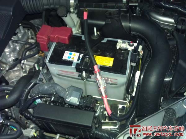 连接在发动机电池的功放电源线材和保险,也要注意走线、同时也要做好安全保护和隔热
