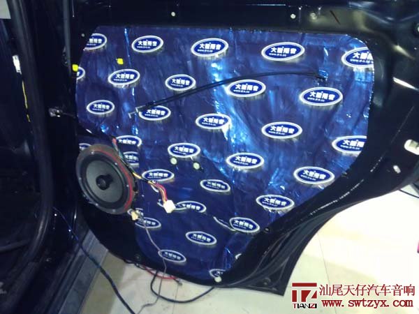 为了抑制车门钢板的共振我们用大能蓝金刚来做四门双层隔音,这样杜绝了因共振引起的谐波失真,声音会更干净有力。同时内层的钢板的一些孔、洞被完全密封了,使车门形成了一个类似于音箱的箱体,为喇叭提供了一个更理想的工作环境。