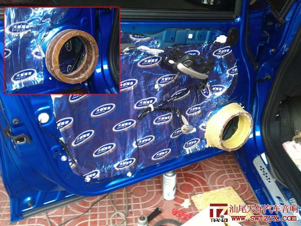 车门隔音减振,中低音单元安装在车门下侧,利用木质垫圈加固减振。