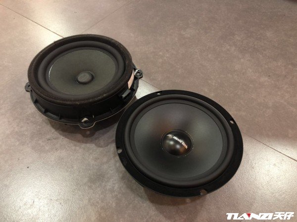 给大家看一下拆下来的原车喇叭和即将安装的乐聆喇叭的对比,原车喇叭的音盆采用的是纸盆,乐聆的喇叭采用的是特殊配方(轻量化组份处理工艺)的pp材料的喇叭鼓纸(音盆、振膜),以适应更高灵敏度设计要求的同时、更可以轻松应对汽车车门内的各种高温、潮湿等恶劣的工作环境。