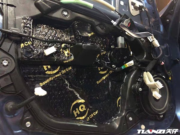 接着是门板外第二层隔音材料进行满贴施工处理,从而能够有效的强化隔音同时起到密封作用,把车厢和外界隔绝,内部声场变成密封的空间,声音不会乱跑,失真率大大降低,从而有效优化喇叭的效果。